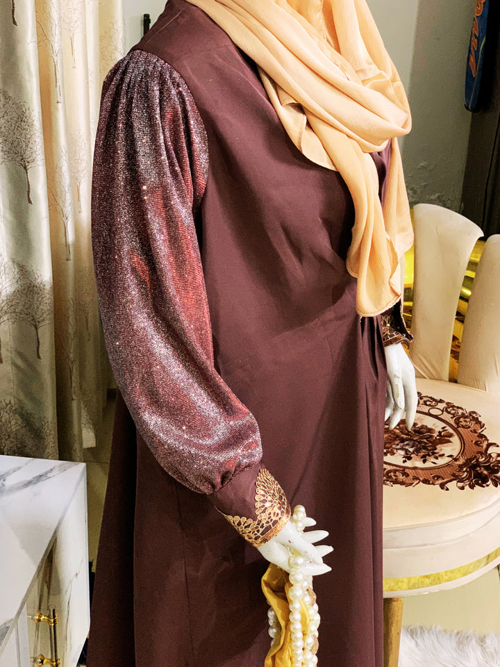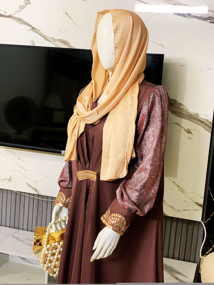 A brown abaya with shimmer sleeves is the perfect fusion of modesty and glamour, offering a sophisticated yet understated look.