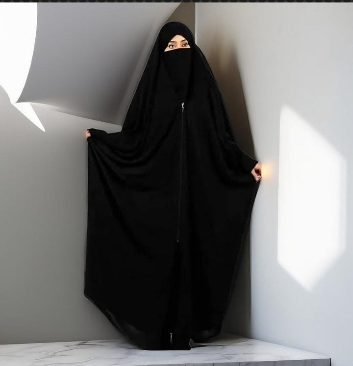 Inspired by traditional Iranian modest wear, this Chadar-style abaya combines full coverage with modern practicality. It features a center zip closure, offering ease of wear while maintaining a sleek, modest look. The flowing silhouette drapes gracefully, making it perfect for prayer, everyday wear, or formal gatherings.
