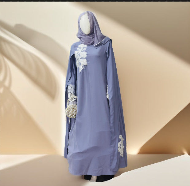 Grace meets serenity in The Tranquil Veil Abaya, a timeless piece designed to embody calm sophistication and modest luxury. Rendered in a soothing fabric tone (sky blue), this abaya features a double-layered silhouette that flows effortlessly with every step, offering both structure and elegance.